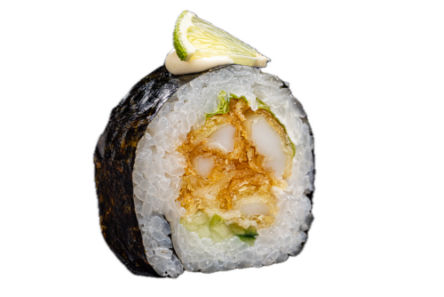 krewetka tempura/ serek kremowy/ ogórek/ por/ sałata/ sos kobe