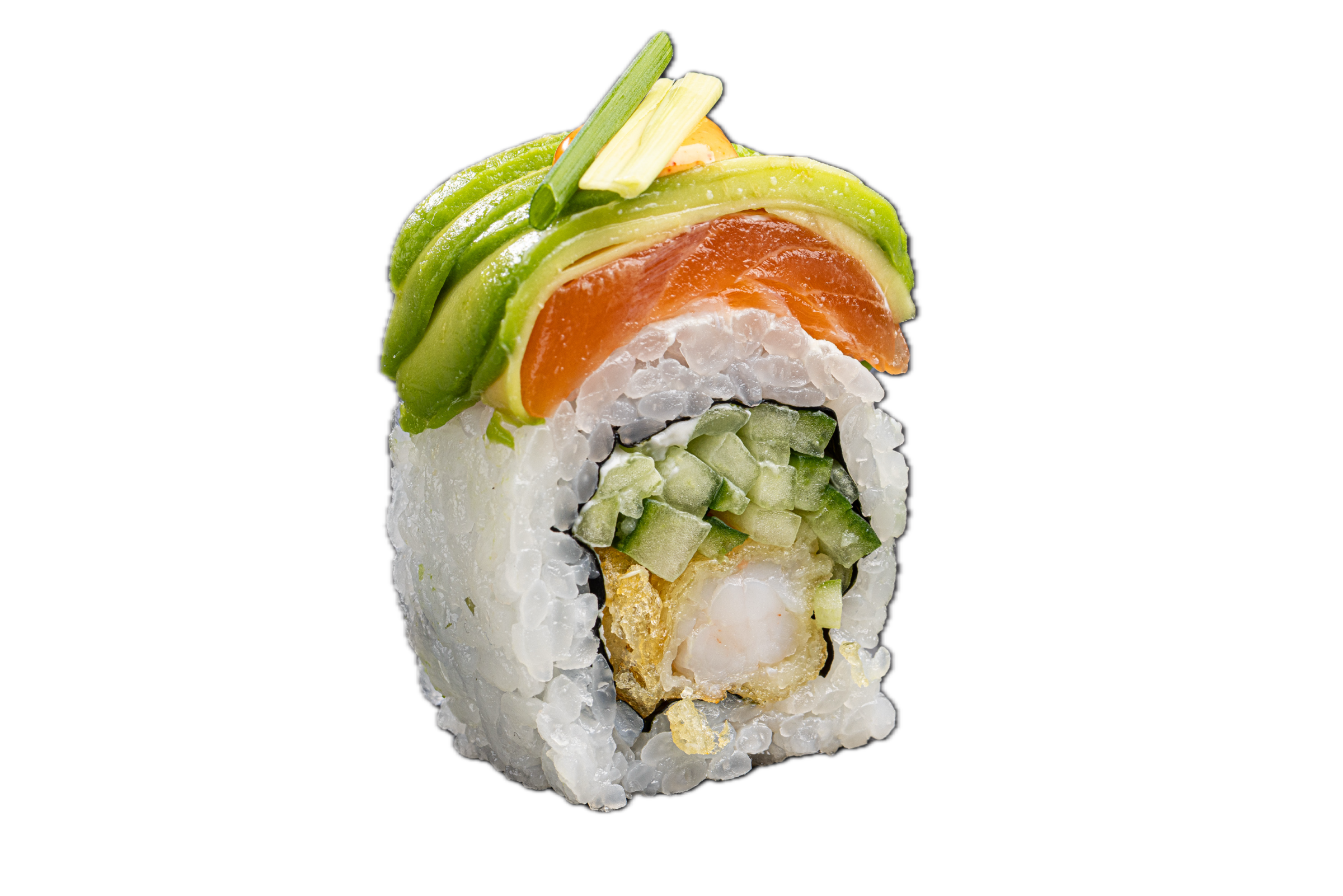 krewetka tempura/ ogórek/ awokado/ łosoś/ por/ sos kobe