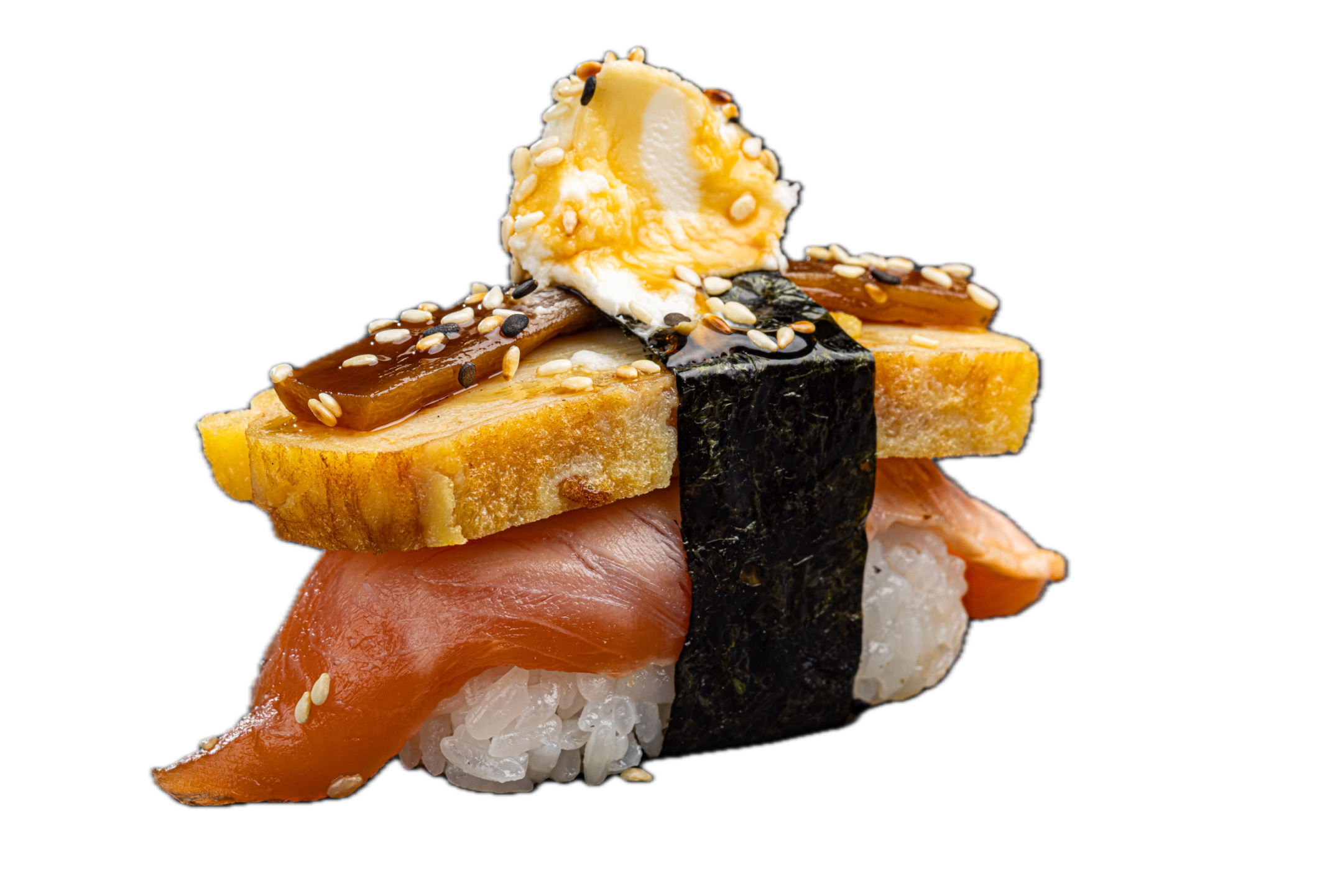 łosoś/ tamago/ tykwa/ serek/ sos teriyaki salmon/ tamago egg/ gourd/ sessame seeds/ teriyaki sauce